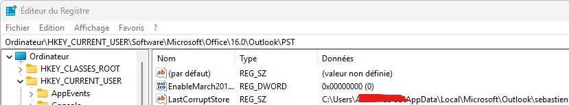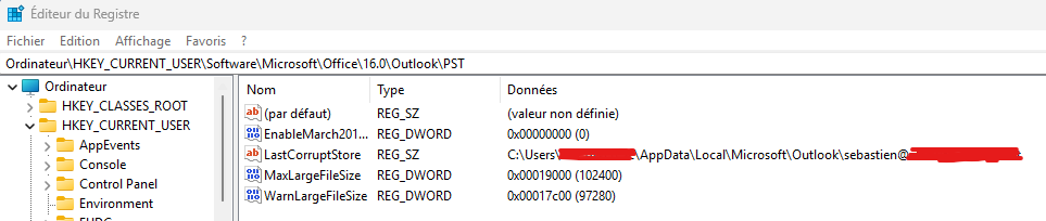 Étape 3 : accéder à la clé Outlook “PST”